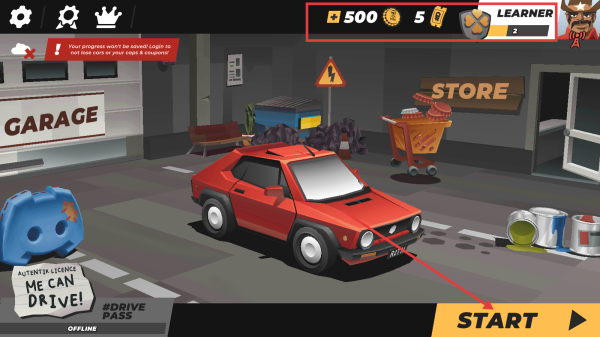 1、进入游戏前,留意界面上方的资源数值(金币、道具等)和等级信息,可前往【STORE】购买道具或升级车辆,准备就绪后开启游戏。