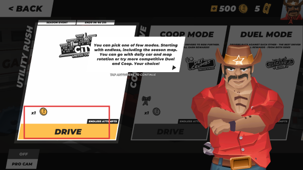 2、游戏模式选择时,可先从【ENDLESSATTEMPTS】的【DRIVE】模式入手,熟悉游戏操作和赛道环境,后续再尝试更具竞技性的模式。