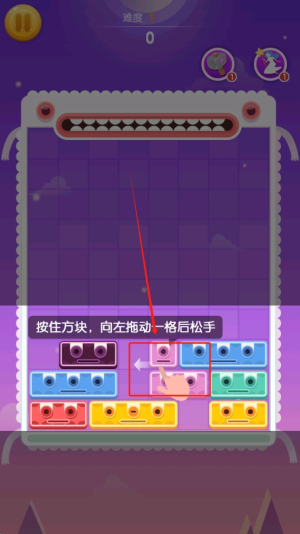 2、移动方块消除:通过左右滑动屏幕,调整方块位置,将三个及以上相同颜色方块连成一线,点击触发消除。