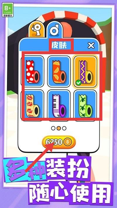 1、在【皮肤】界面,可使用金币(如6250金币)解锁多样皮肤,装扮角色,增添游戏乐趣。