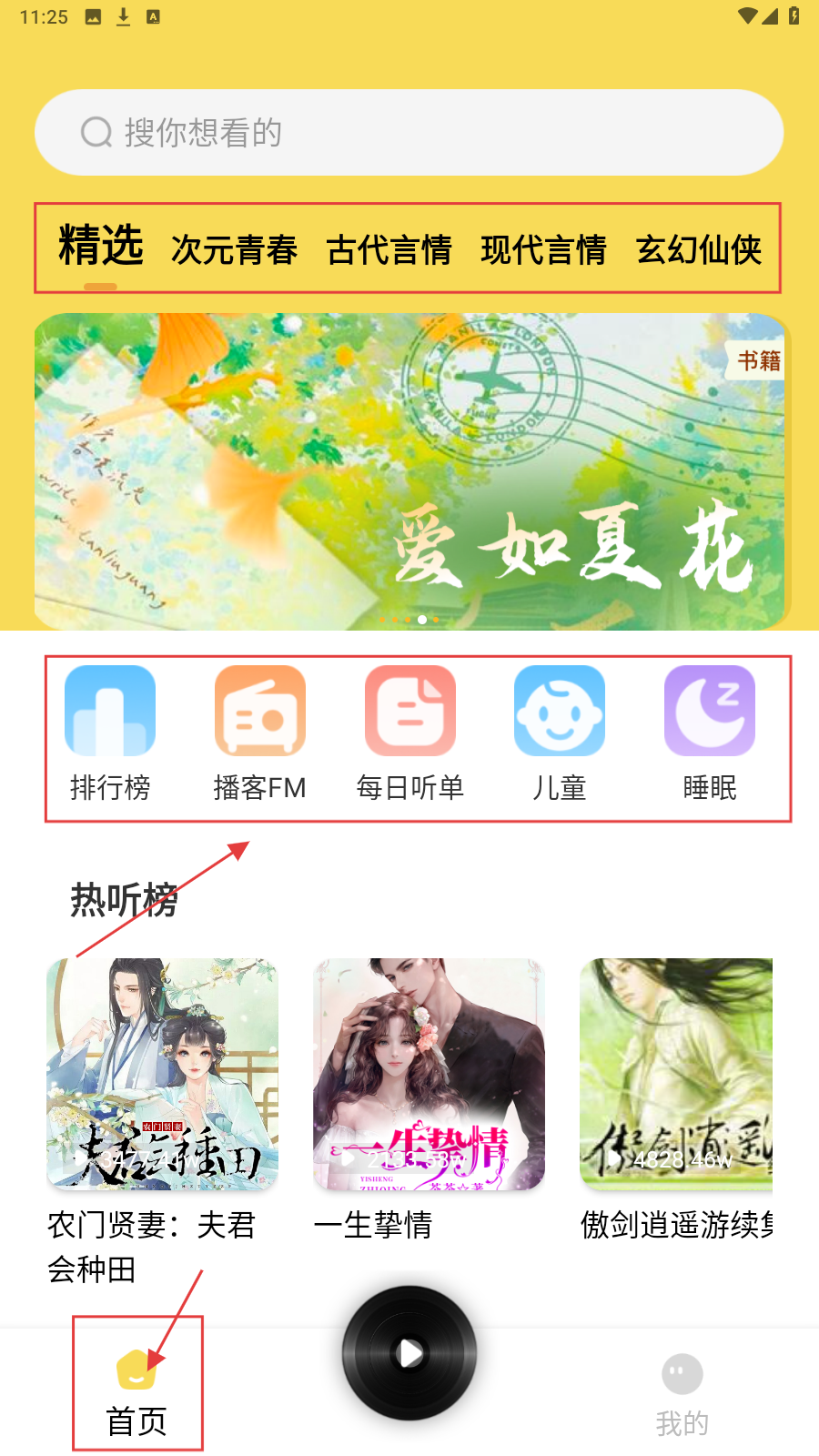 1、进入APP【首页】,通过分类(精选、古代言情等)或【排行榜】【播客FM】等入口,找想听内容。