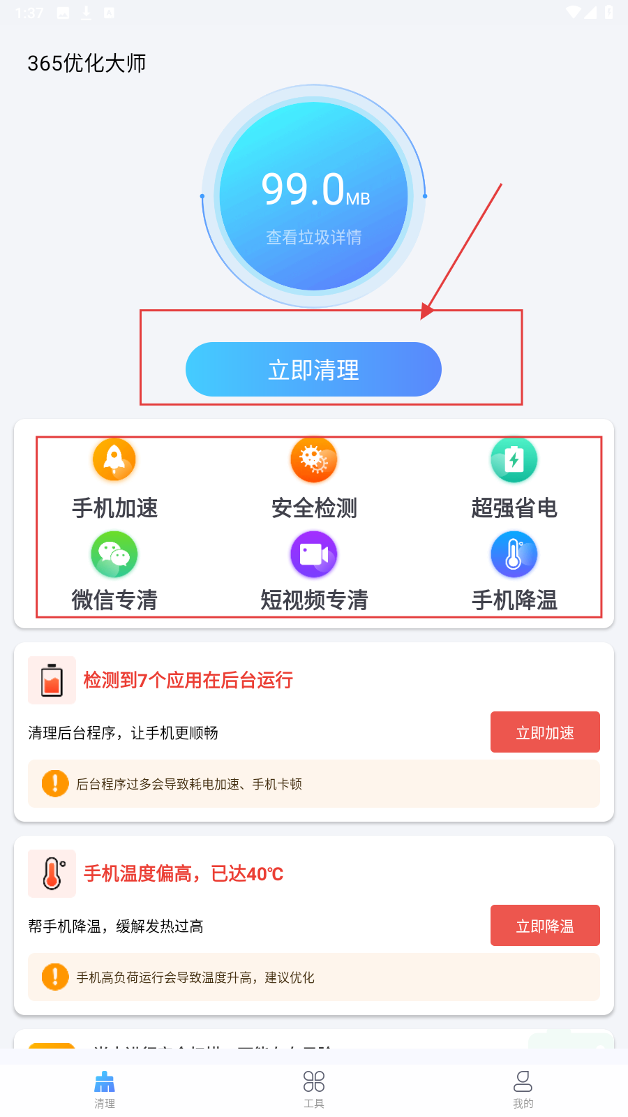 1、在首页,可点【立即清理】清理垃圾,用【手机加速】【安全检测】等功能(如微信专清、短视频专清)。