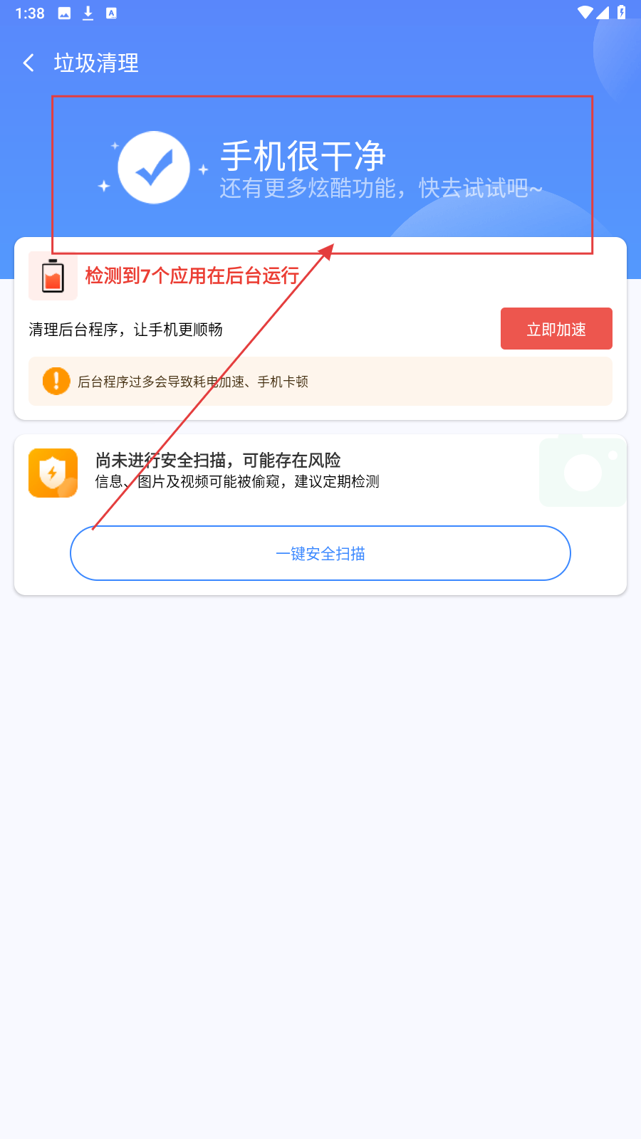 2、点【立即清理】后,进入垃圾清理结果页,显示“手机很干净”,还可处理后台应用、安全扫描提醒。