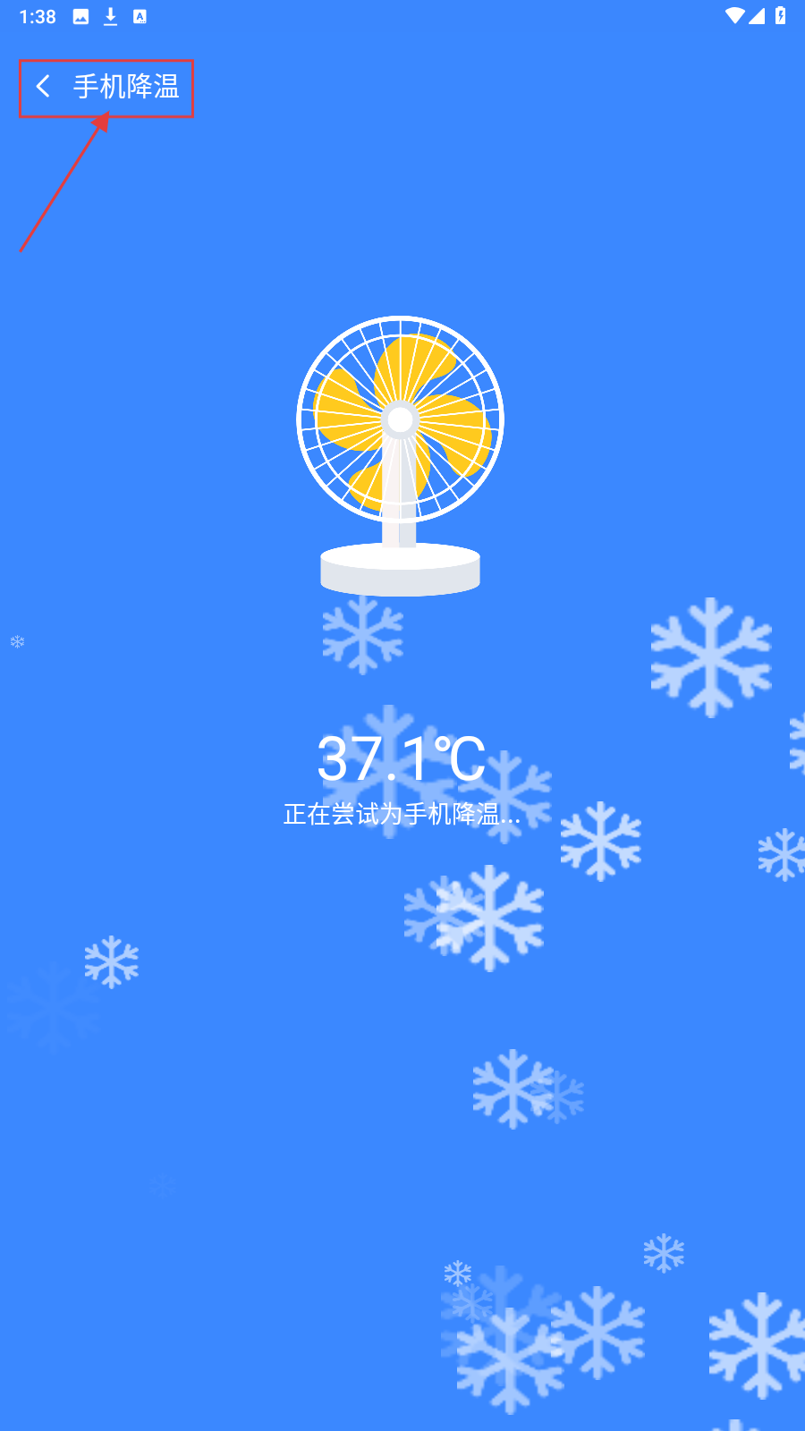 3、点【手机降温】,进入降温页,显示当前温度,尝试为手机降温,完成优化手机流程。