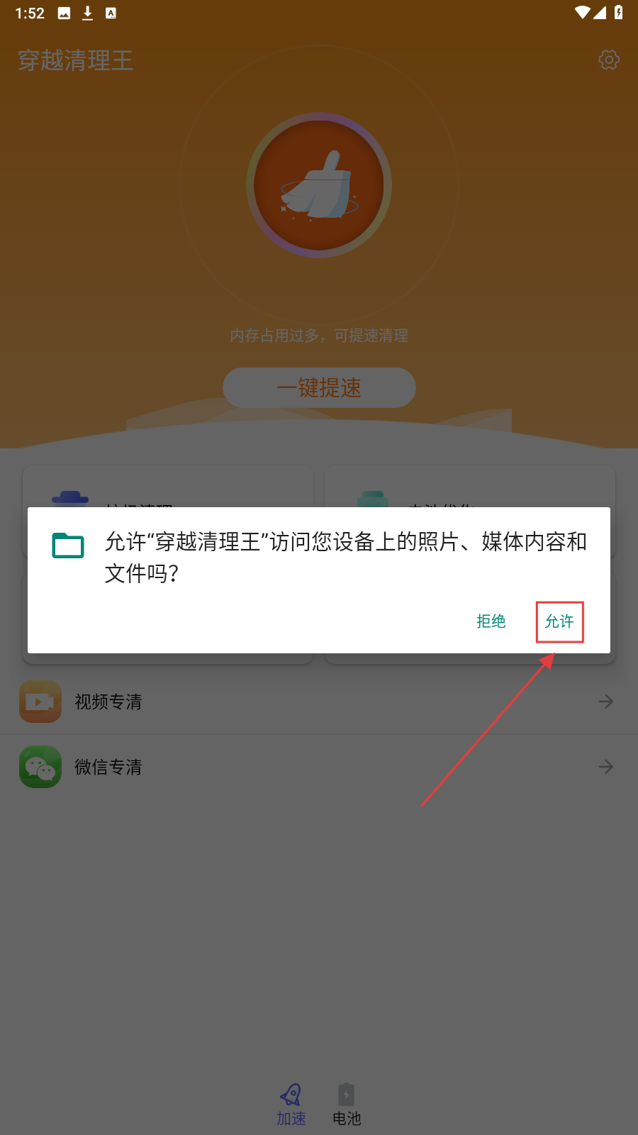 1、首次打开,会弹窗请求访问设备照片、媒体和文件,可点【允许】授权,进入主界面(有一键提速、垃圾清理等功能)。