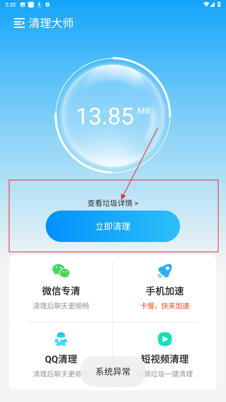 1、打开应用,首页有13.85MB待清理垃圾,可点【立即清理】或用微信专清等功能。