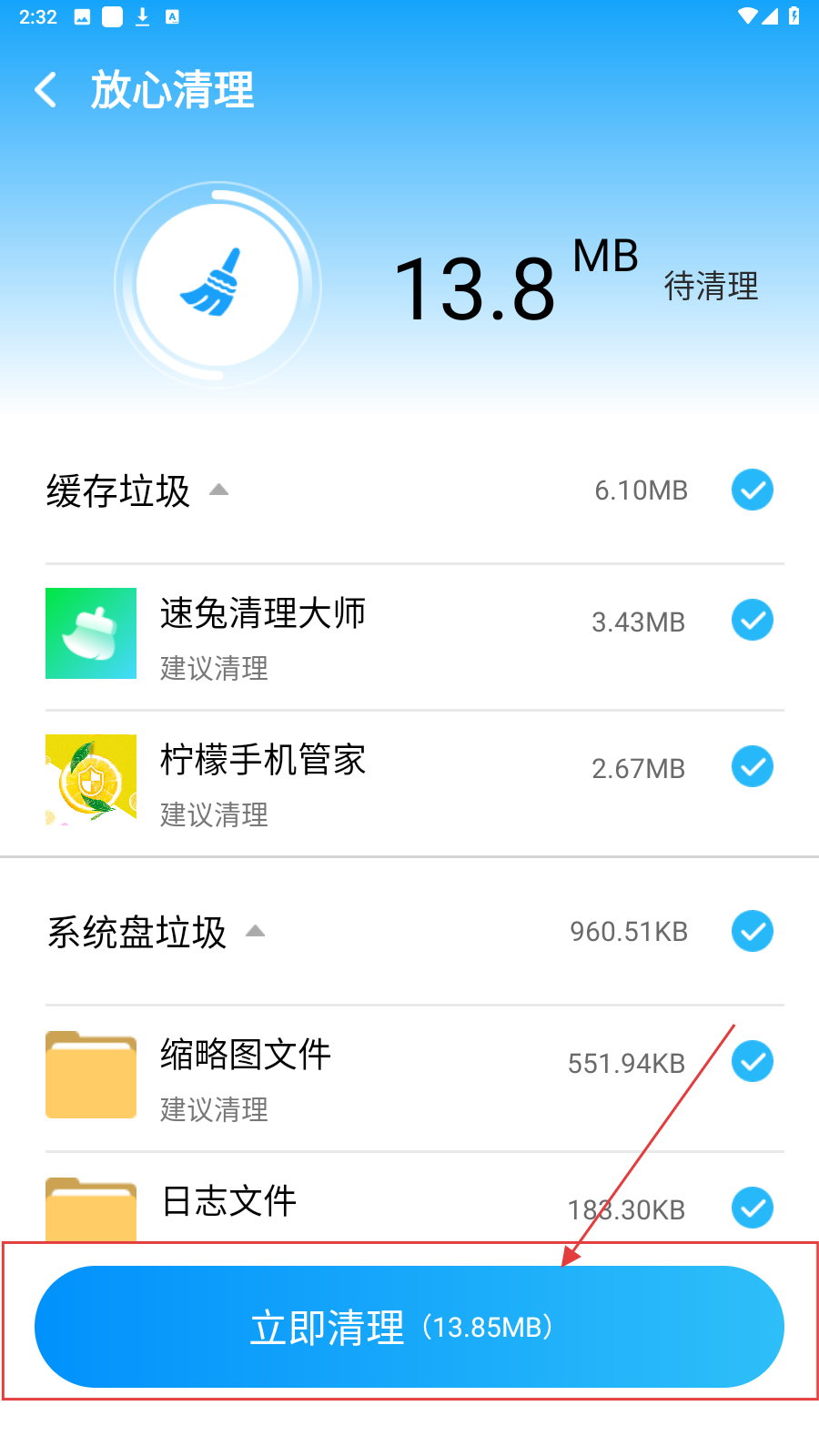 2、进入【放心清理】,显示缓存、系统盘等垃圾分类,点【立即清理(13.85MB)】操作。