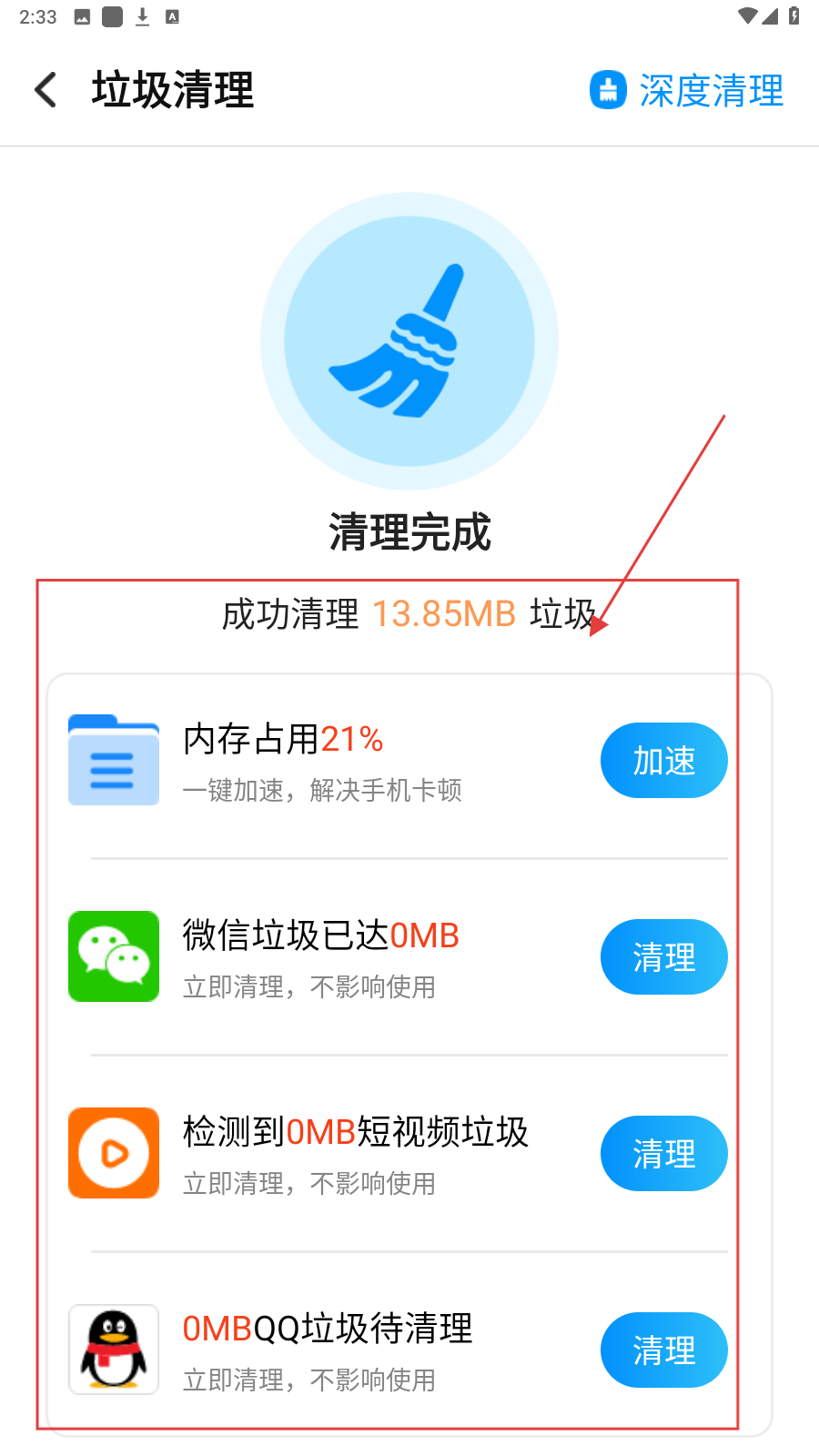 3、清理后,结果页显示成功清理13.85MB,还有内存、各应用垃圾状态及清理入口。