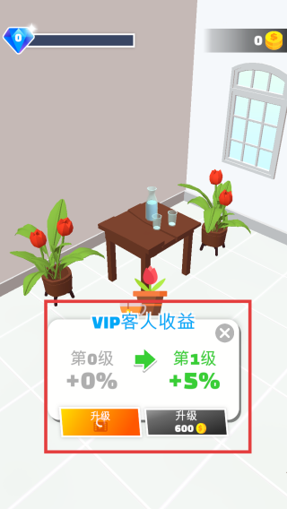 1、游戏中留意“VIP客人收益”,当有升级提示时,若金币充足(如升级需600$),优先选择升级,以增加后续收益。