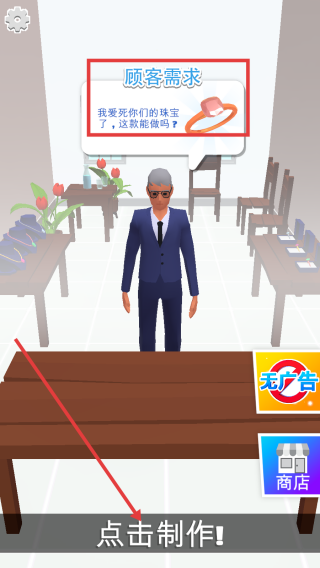2、遇到顾客需求,点击“点击制作!”,根据顾客需求界面,按提示操作,完成珠宝制作任务。