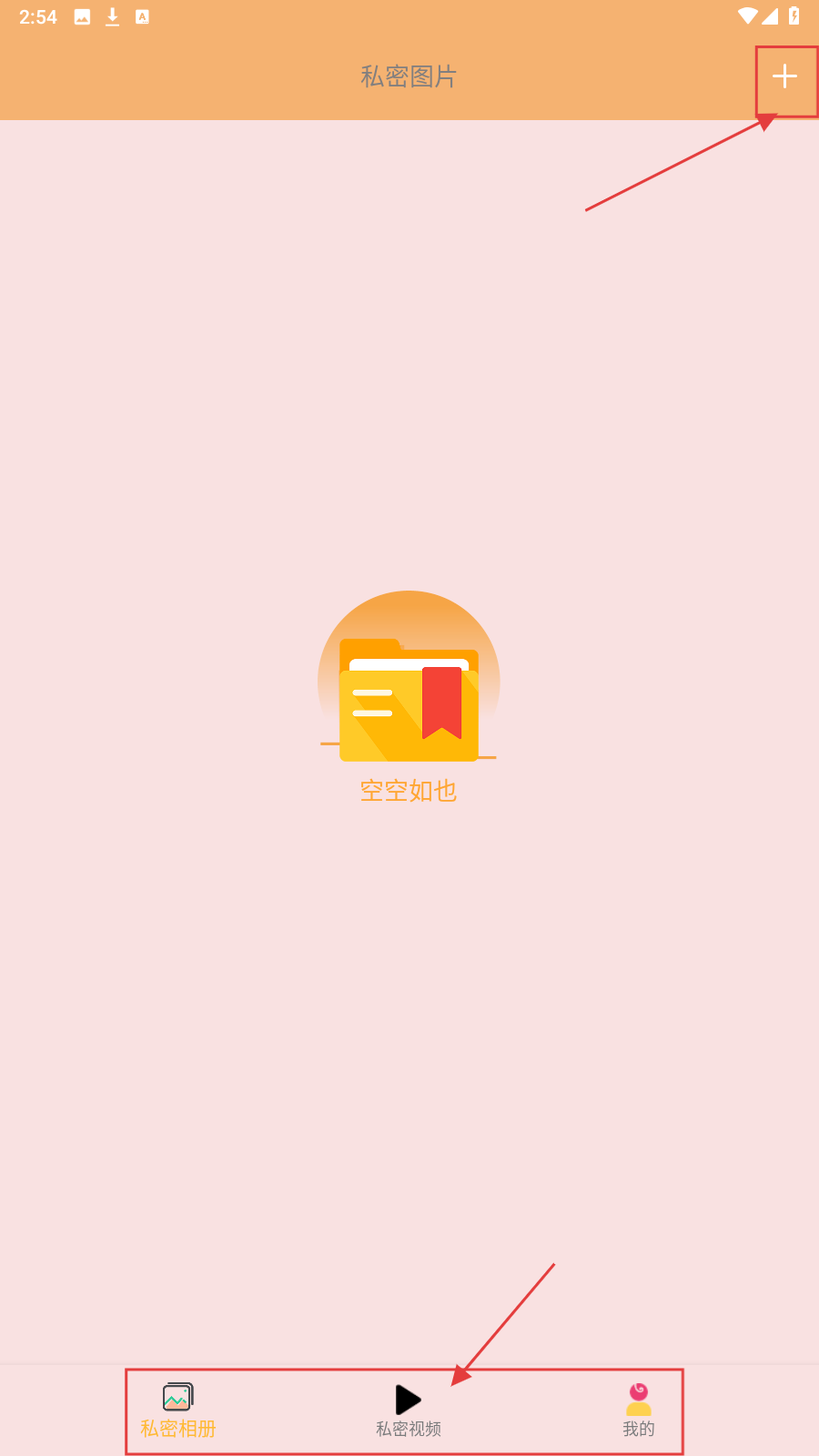 2、密码设置后,进入【私密图片】页,有“空空如也”提示,可点右上角【+】,底部切换【私密相册】【私密视频】【我的】。
