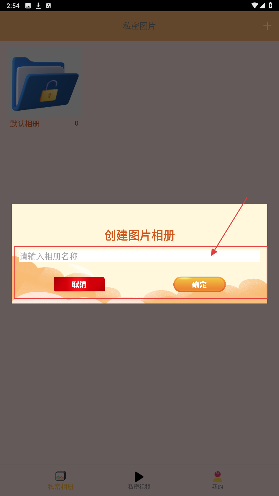 3、点【+】创建相册,在【创建图片相册】弹窗输名称,点【确定】或【取消】,完成私密相册创建流程。