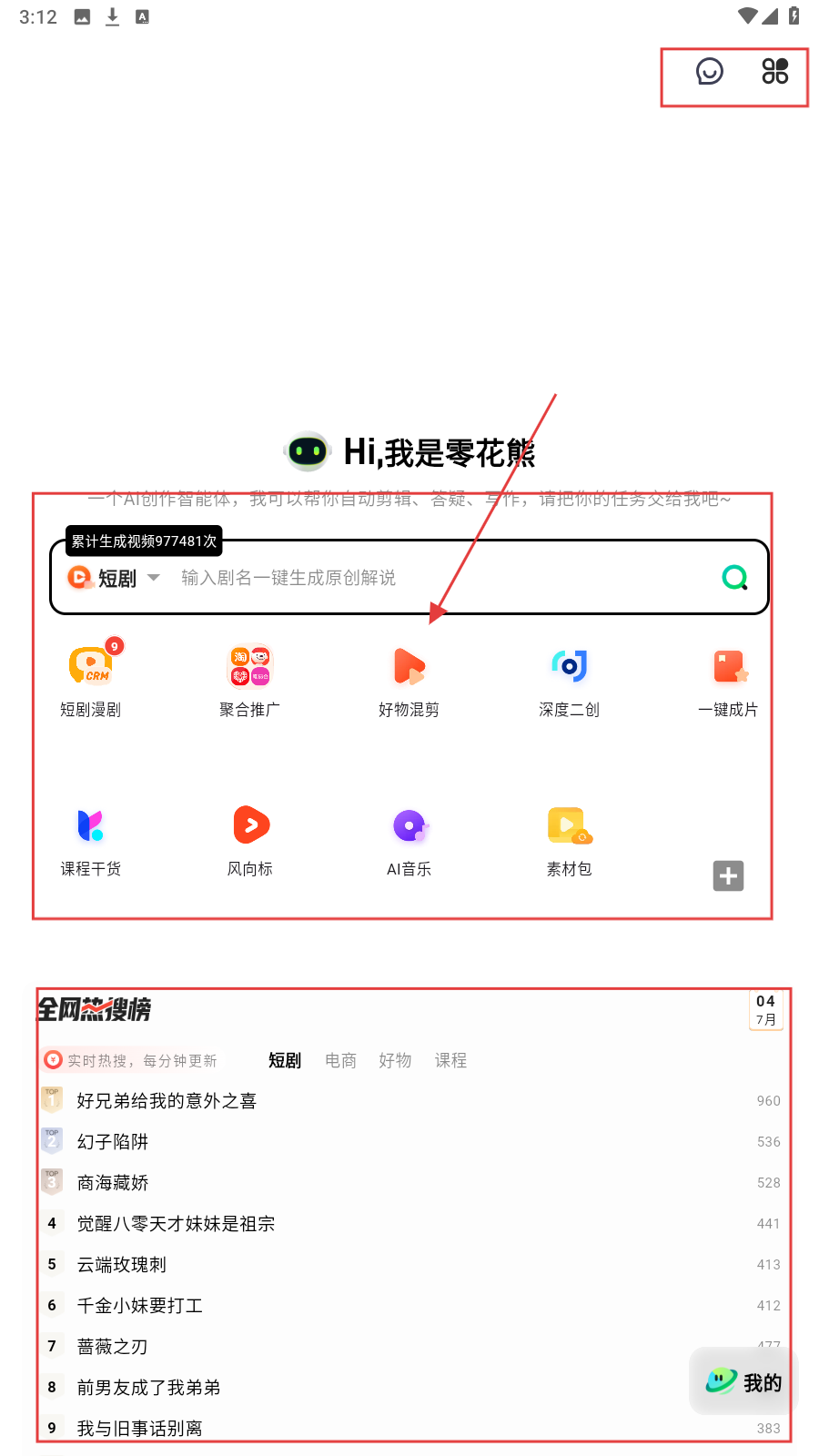 1、进入应用首页,可在搜索框输剧名生成解说,下方有短剧漫剧、好物混剪等功能,还有全网热搜榜(实时更新短剧、电商等热搜)。