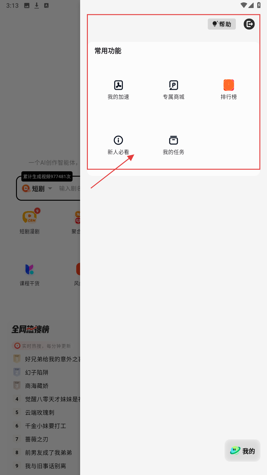 2、点右上角图标,展开【常用功能】栏,含我的加速、专属商城、排行榜、新人必看、我的任务。