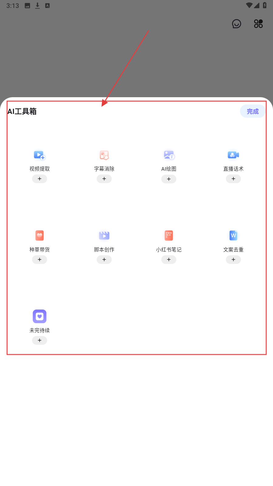 3、进入【AI工具箱】,有视频提取、字幕消除、AI绘图等工具,点“+”添加,完成后点【完成】,实现AI功能使用流程。