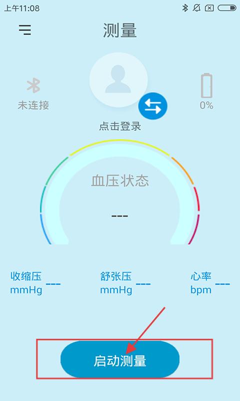 1、打开应用,进入【测量】页,显示血压状态、未连接蓝牙、电量0%,点击【启动测量】开始操作。
