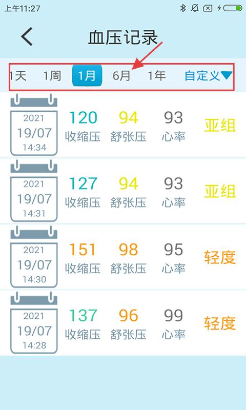 3、进入【血压记录】页,有1天、1周等时间筛选,列表呈现不同时段血压,点击时间筛选查看对应记录。