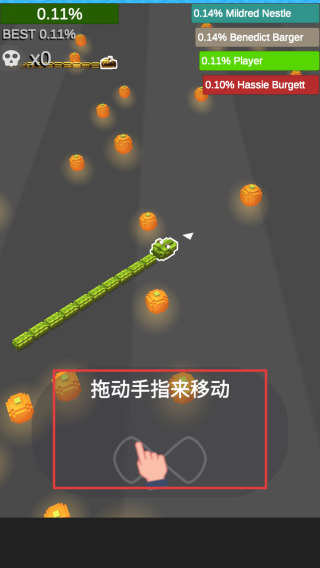 2、在游戏过程中,通过【拖动手指来移动】控制蛇的方向,收集橙色方块。