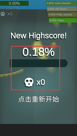 3、游戏结束后,可查看【NewHighscore!】新的高分成绩,若想重新挑战,点击【点击重新开始】。