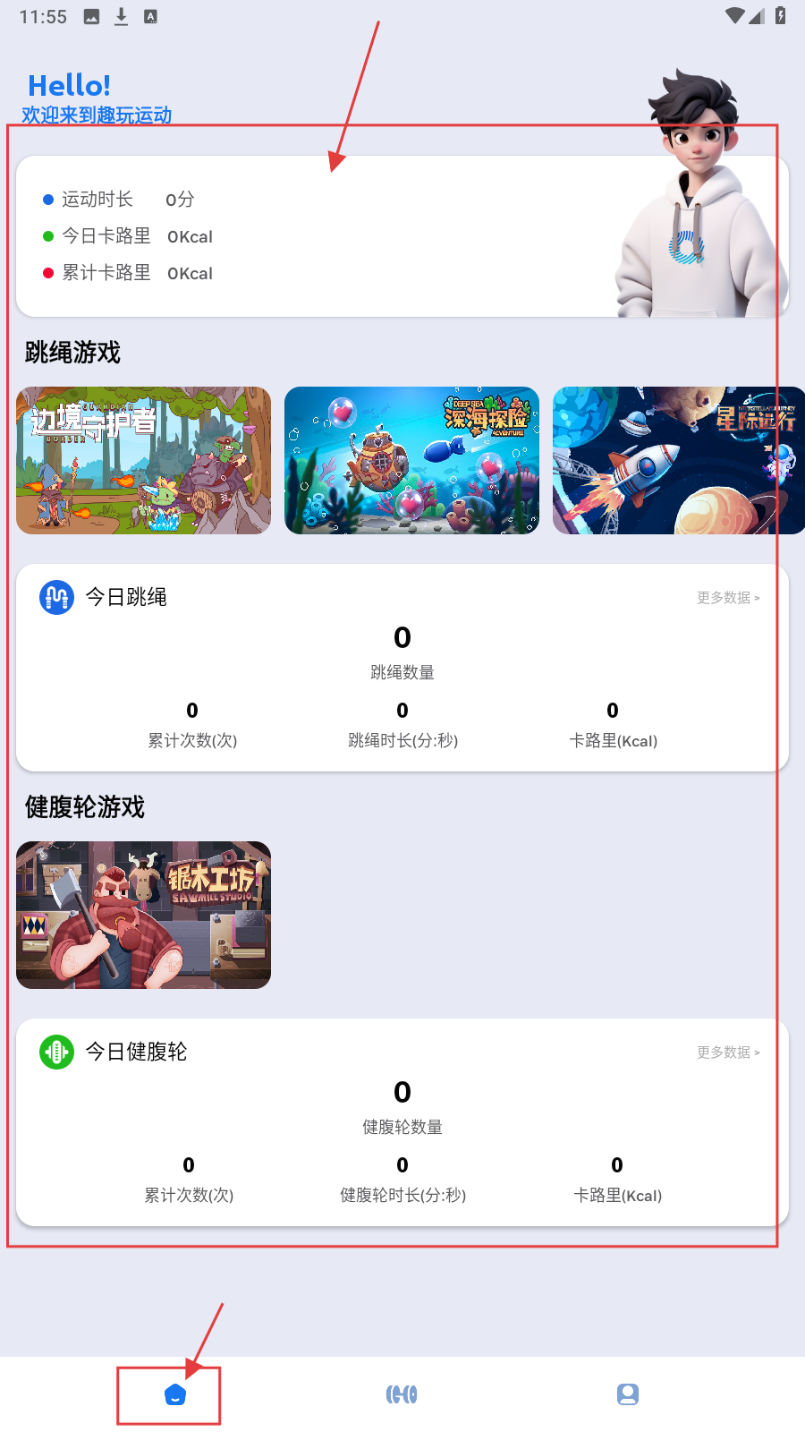 1、打开趣玩运动APP,进入首页,显示运动数据(时长、卡路里)、跳绳/健腹轮游戏及数据,点击底部【首页】图标回到此页。