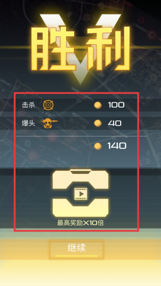 3、成功完成关卡后,查看结算界面的【击杀】和【爆头】奖励,点击相关区域可能获得更高倍数奖励,然后点击【继续】按钮进行后续操作。