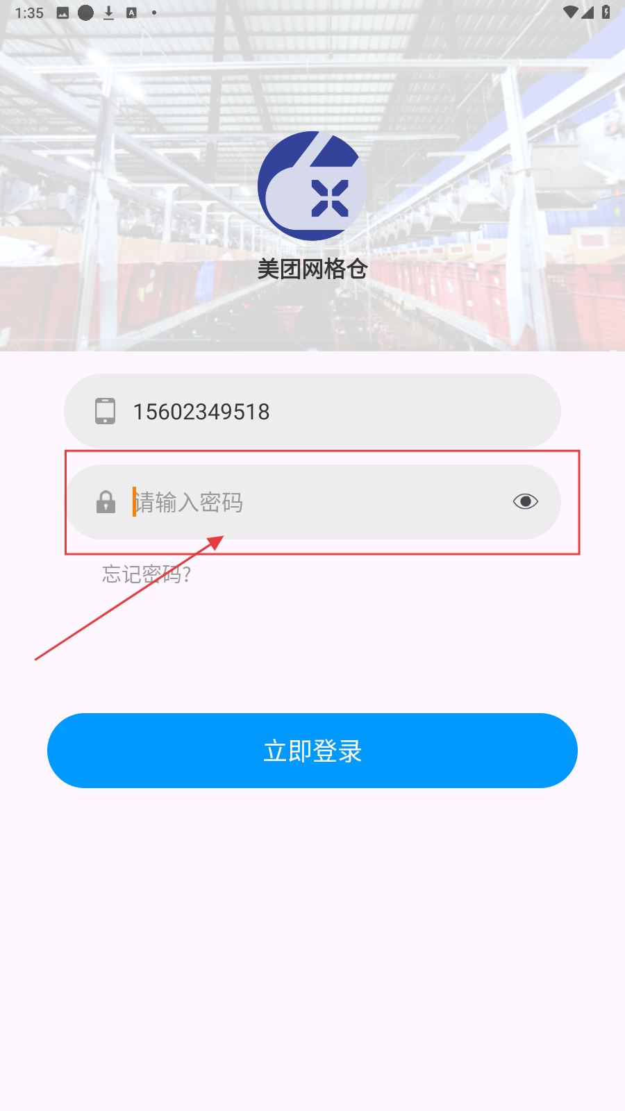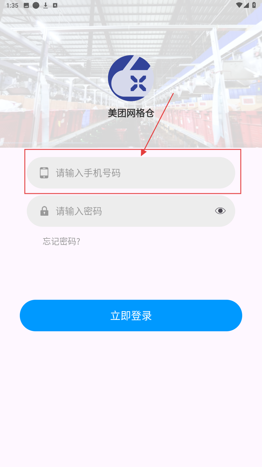 1、打开【美团网格仓】登录页,在【请输入手机号码】框填手机号。