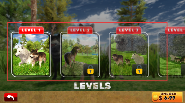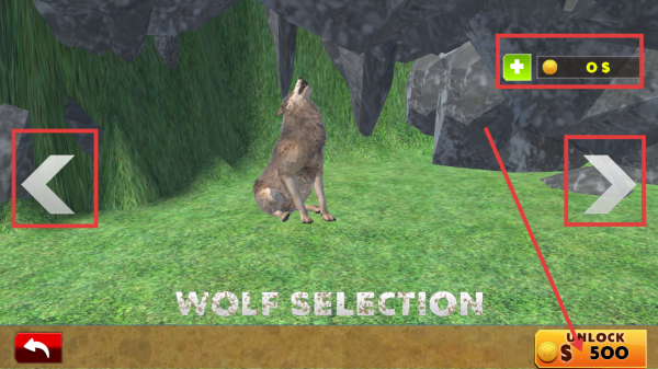 1、在【WOLFSELECTION】界面,通过左右箭头切换查看不同狼的形象,若金币足够(当前为0$),可点击【UNLOCK$500】解锁新狼。