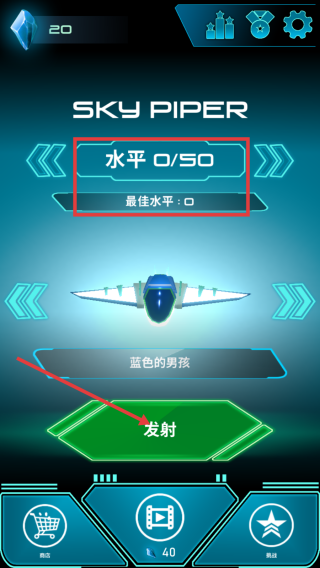 1、在游戏初始界面,可看到当前【水平0/50】和【最佳水平】,点击绿色的【发射】按钮,启动游戏。