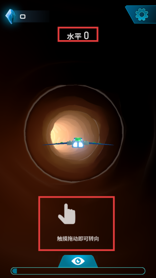 2、进入游戏后,依据提示【触摸拖动即可转向】,通过触摸屏幕拖动来控制飞机在管道内的转向,提升【水平】等级。