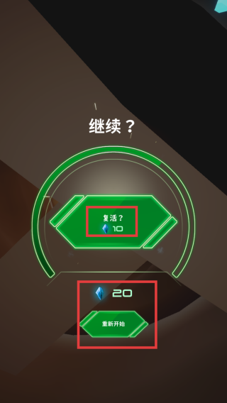 3、游戏失败后,若钻石足够,可花费10钻石点击【复活?】继续游戏;若不想复活,可点击【重新开始】按钮,消耗20钻石重新开启游戏。
