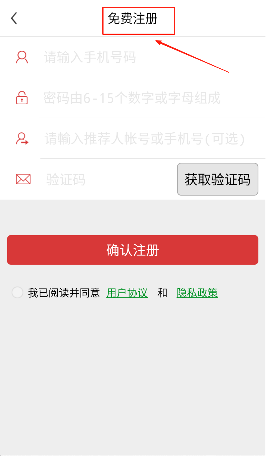 2、新注册先输手机号再设六位以上密码,收验证码填正确后关键点勾用户协议内容框,确认注册键点亮就能点呀。