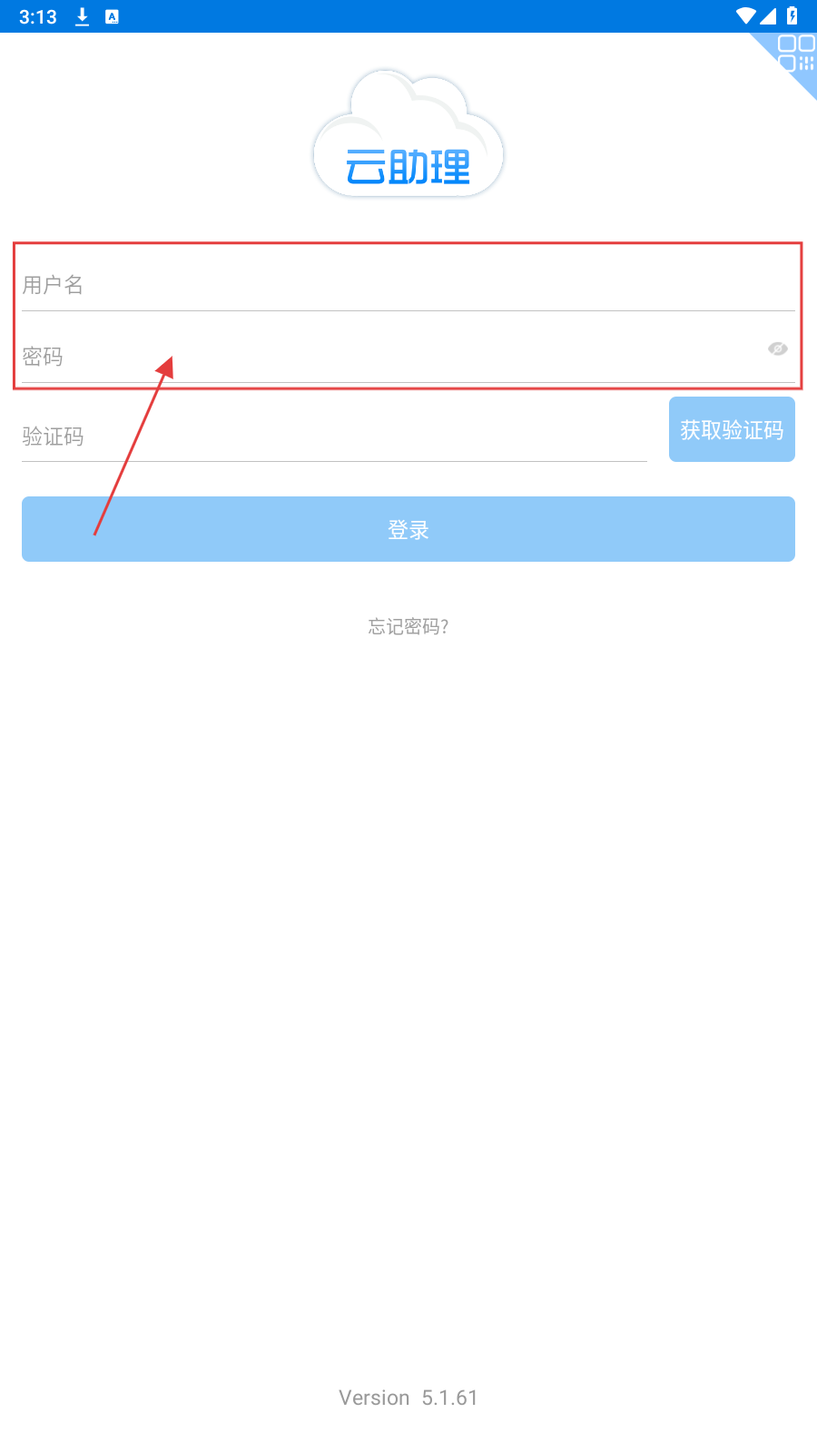 1、打开云助理登录页,在【用户名】框填写账号,在【密码】框填对应密码。