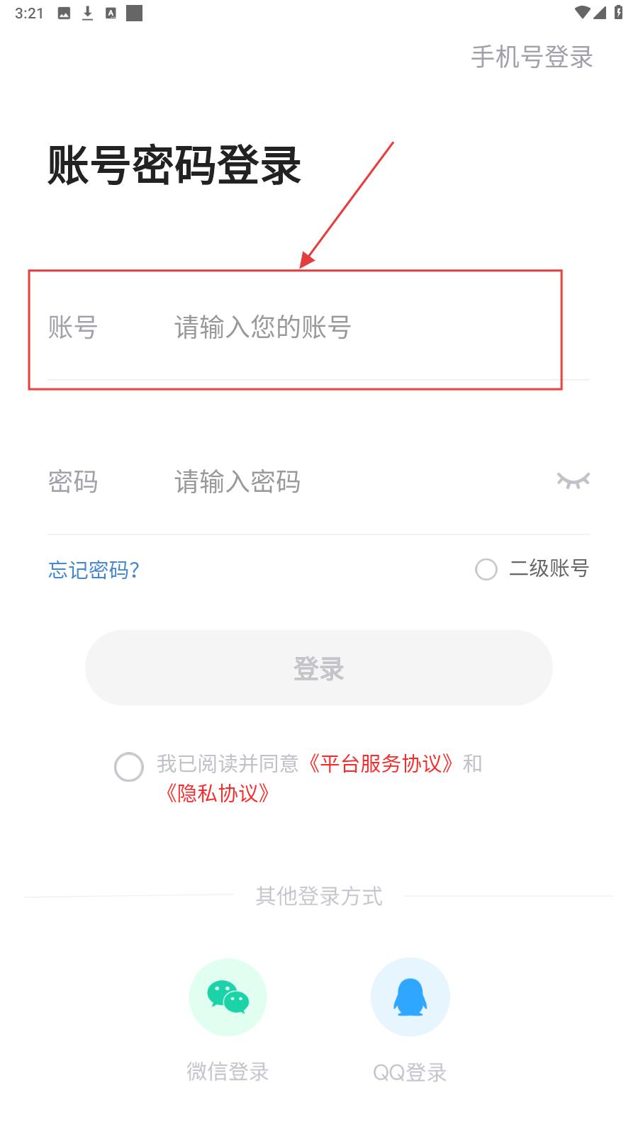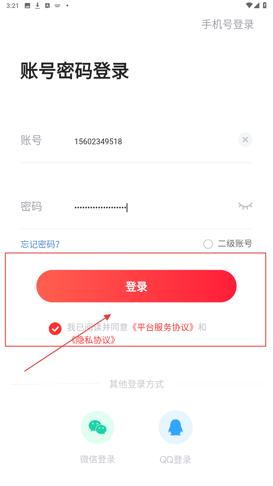 2、【密码】栏填对应密码,勾选【我已阅读并同意《平台服务协议》和《隐私协议》】。