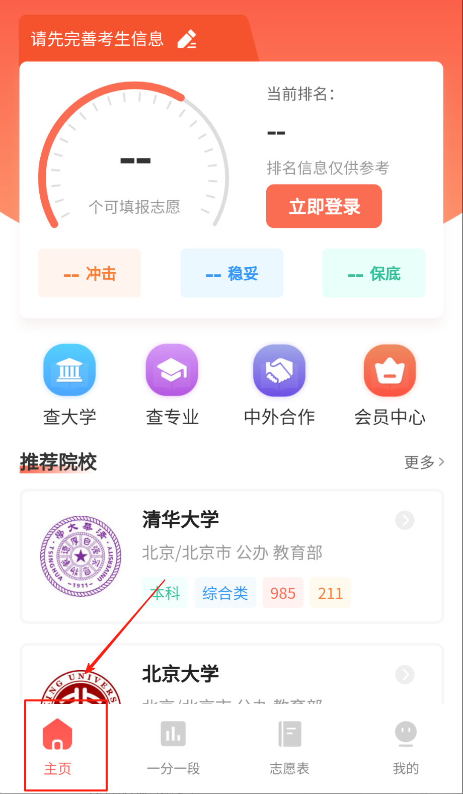 1、首页输入高考分数与全省排名,智能推荐标注"冲稳保"三档院校组合,收藏功能标记心仪专业,历史数据对比三年位次波动哦。