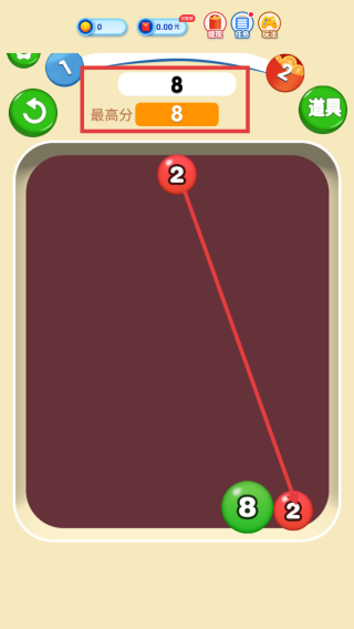 1、游戏中留意上方显示的当前分数和最高分,明确目标是通过合并数字球来提高分数,后续努力突破该分数。