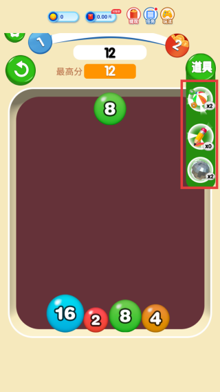 3、右侧“道具”栏有不同功能道具,像倍数道具可加倍得分。在合适时机使用道具,助力获取更高分数,冲击更高记录。