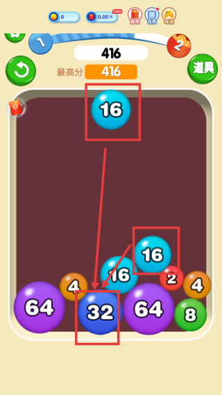 2、将相同数字的球合并,例如2和2合并成4,4和4合并成8,以此类推。观察球的数字和位置,规划合并路径。