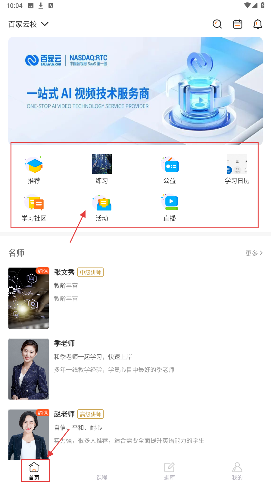 1、打开应用,【首页】有搜索框、日历等图标,及推荐、练习等功能板块,还有张文秀等名师信息,可点击进入相关页面。