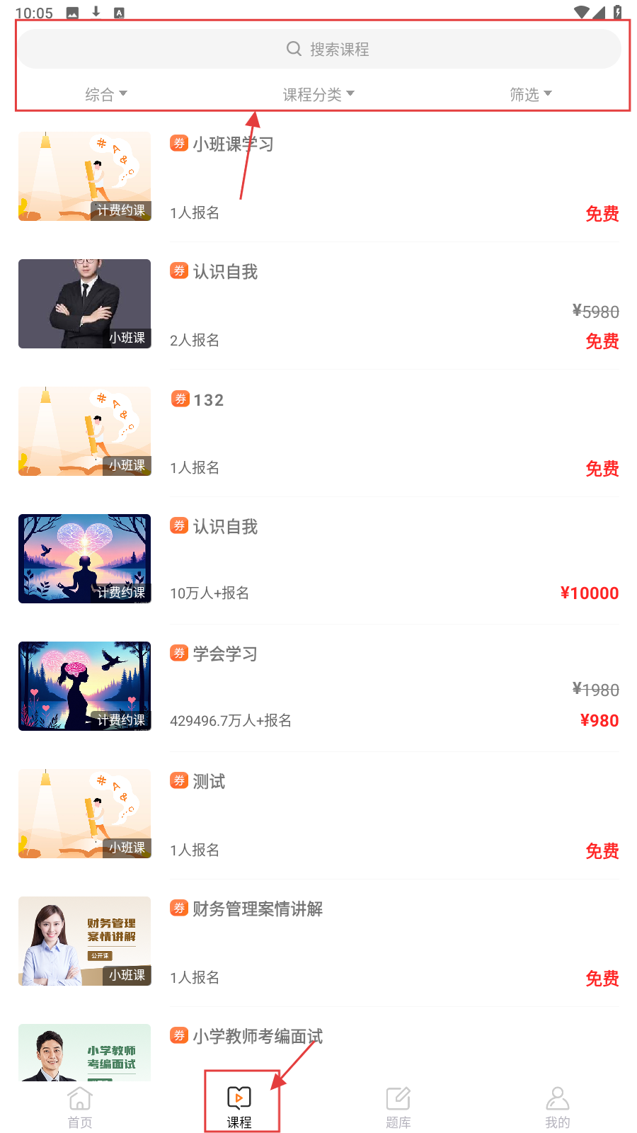 2、切至【课程】页,有课程搜索栏,用综合条件、分类等找课,页面展示小班课学习等课程及类型、人数等信息。