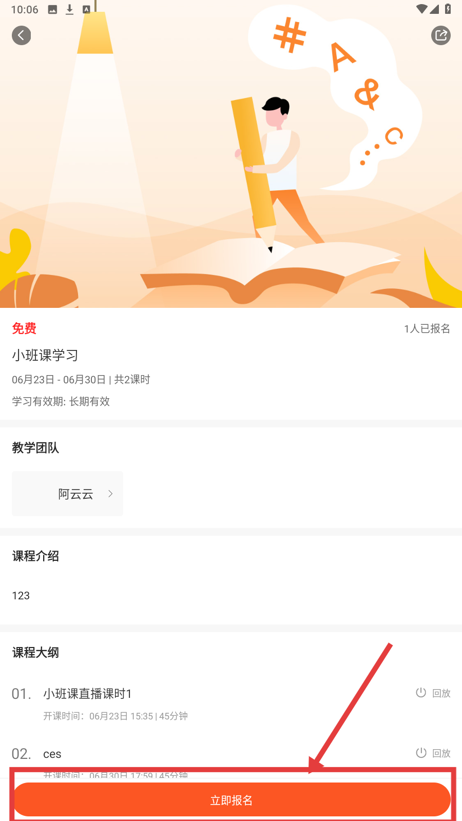 3、选课程进【详情页】,看开课时间、有效期等,点【立即报名】参与课程。