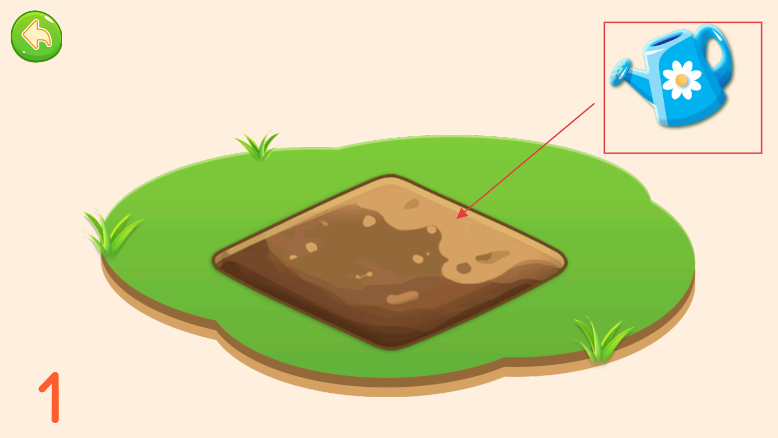 2、页面有土地、蓝色浇水壶,点击浇水壶可模拟给土地浇水互动,跟随互动动画认识数字1。