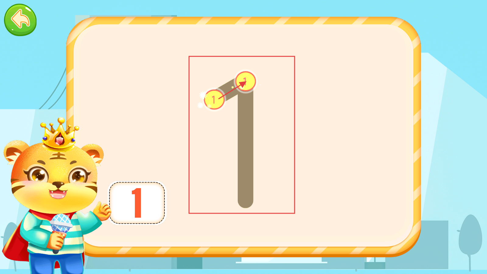 3、在数字书写页面,有卡通老虎引导,显示数字“1”书写轨迹,按轨迹顺序(从“1”上方黄点到下方黄点)点击书写。