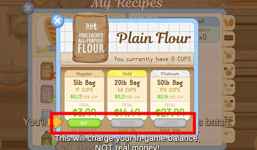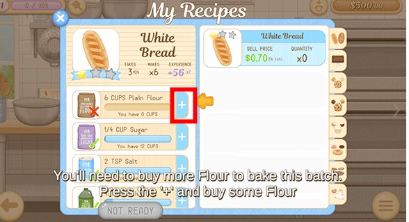 1、制作“WhiteBread”等食谱时,关注食材需求,库存不足时,点击“+”号,按需购买不同规格面粉,确保制作顺利。