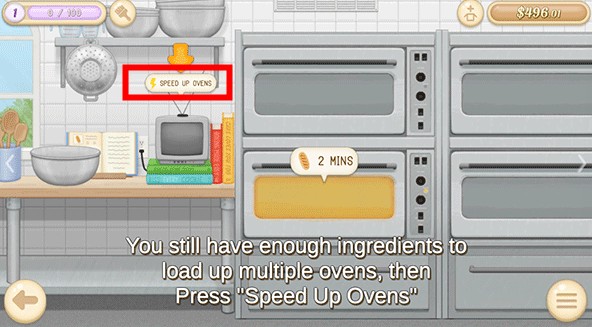 2、拥有足够食材后,可在多个烤箱中放入食物,点击“SpeedUpOvens”按钮加速烤制,节省时间,提高制作效率。
