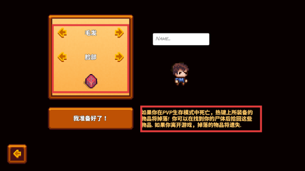 1、在角色创建界面,通过“毛发”“脸部”两侧箭头调整外观,确认后点击“我准备好了!”进入游戏。注意PVP生存模式死亡物品掉落规则。