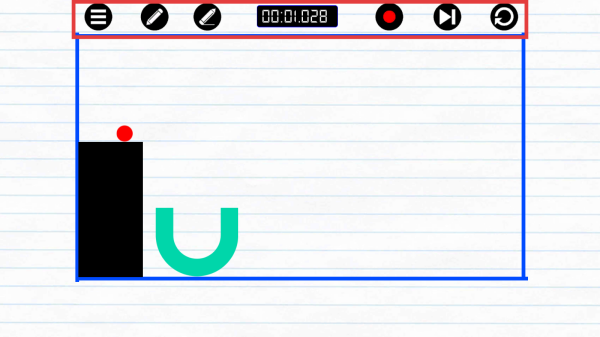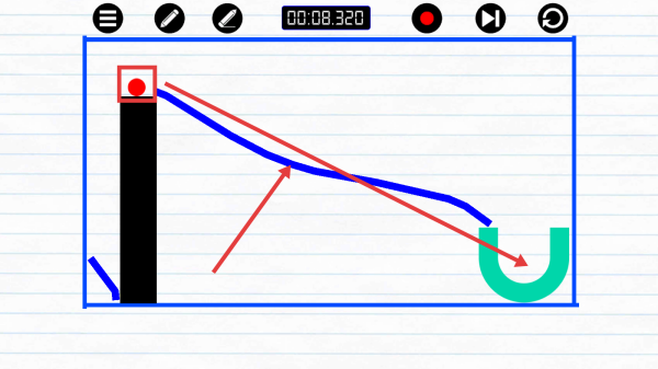 2、利用画笔工具绘制线条,引导红色小球移动,使其顺利到达绿色U形区域,完成关卡目标。注意绘制线条的角度和长度。