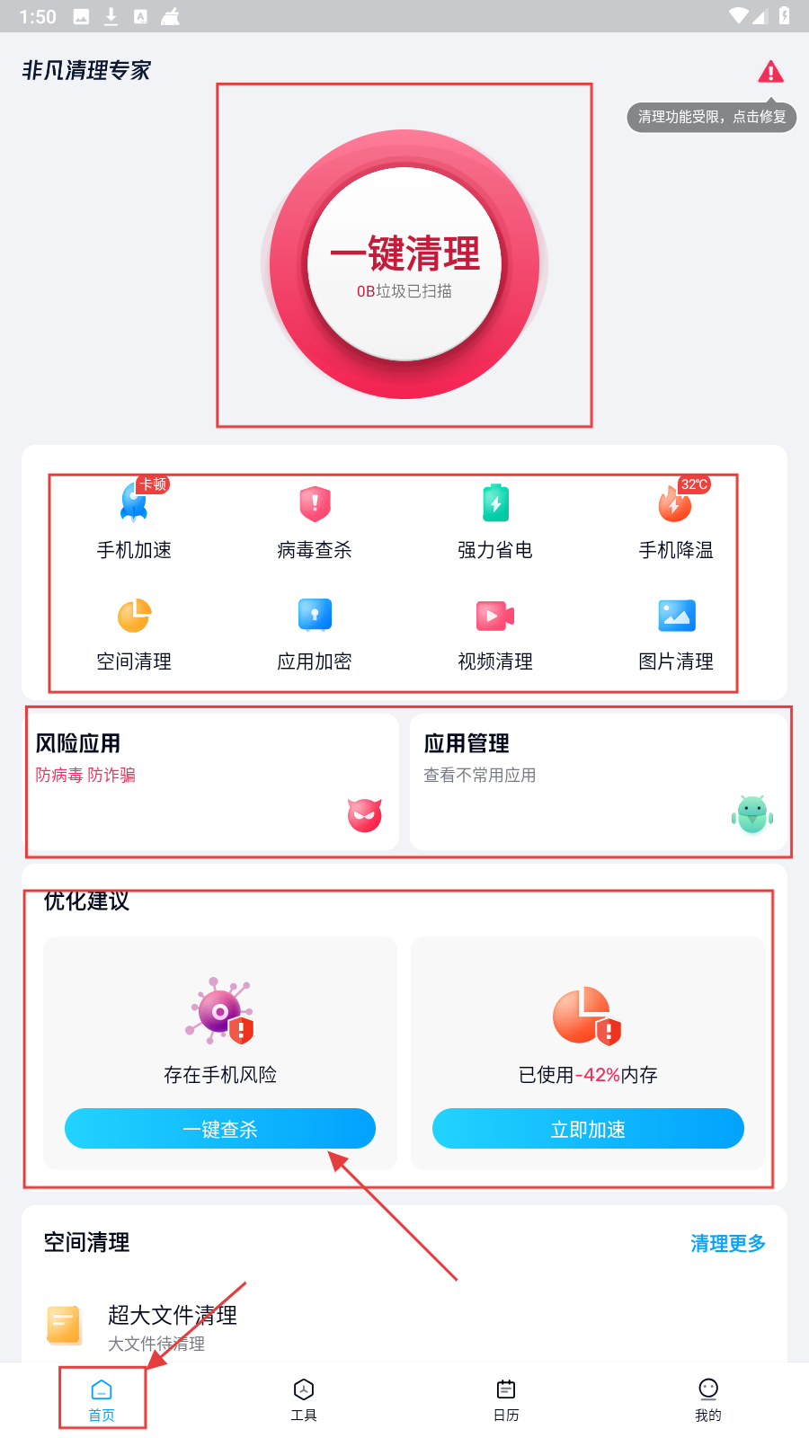 1、打开【非凡清理专家】应用,在【首页】看到“一键清理”及手机加速、病毒查杀等功能,点击【优化建议】栏的【一键查杀】。
