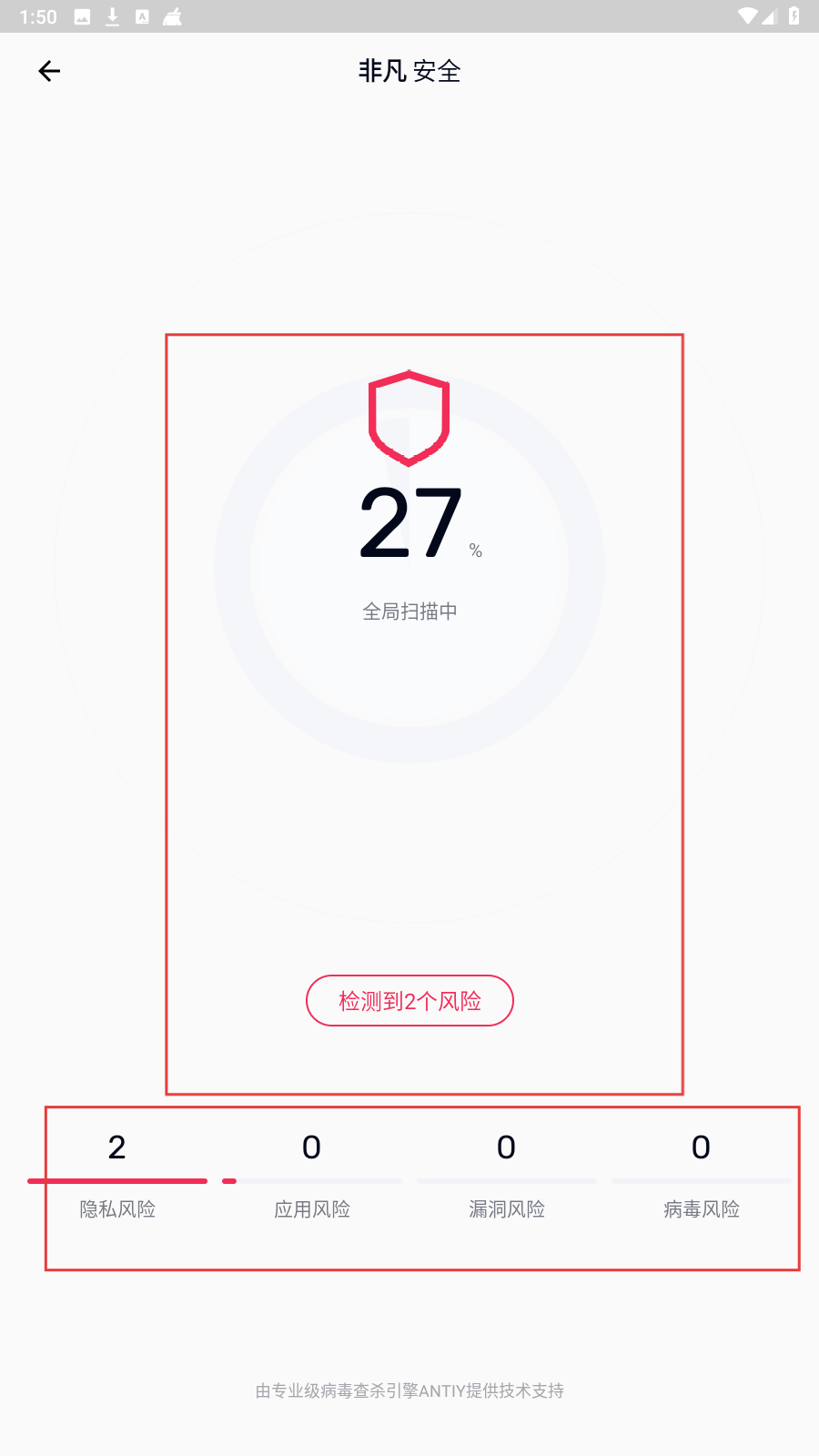 2、进入【非凡安全】页面,等待全局扫描(如27%进度),查看检测到的风险(隐私风险等)。