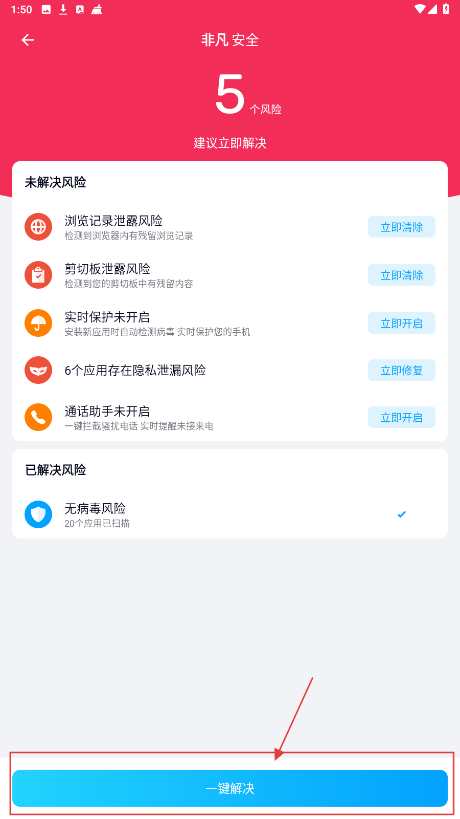3、扫描完成,显示5个未解决风险(浏览记录泄露等),点击底部【一键解决】,处理手机安全风险。