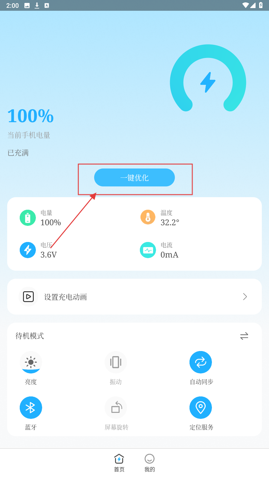 1、打开应用,在首页看到当前手机电量100%已充满,点击蓝色【一键优化】按钮。